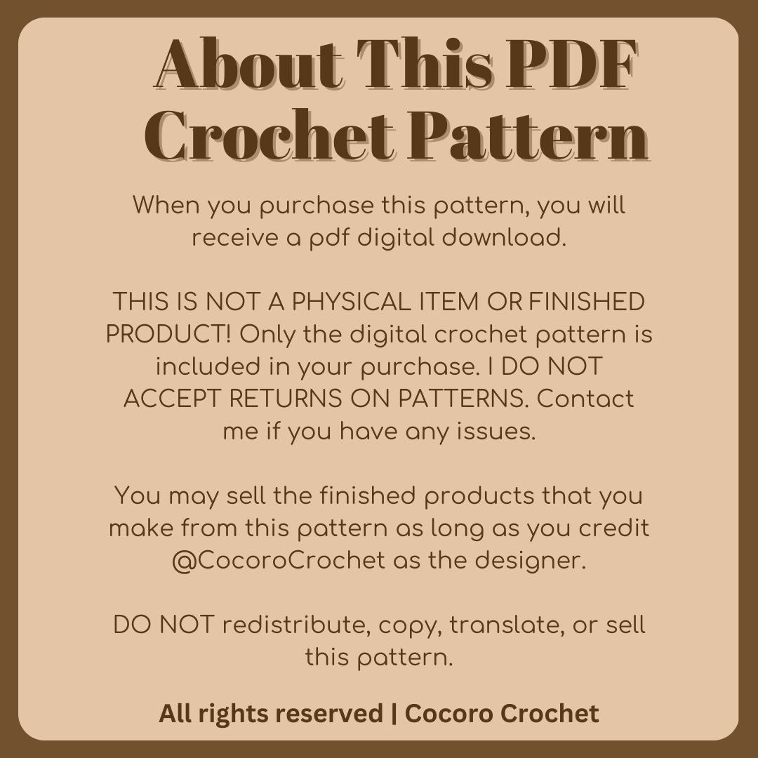 When you purchase this pattern, you will receive a pdf digital download. THIS IS NOT A PHYSICAL ITEM OR FINISHED PRODUCT! Only the DIGITAL crochet pattern is included in your purchase. Contact me if you have any questions or concerns.