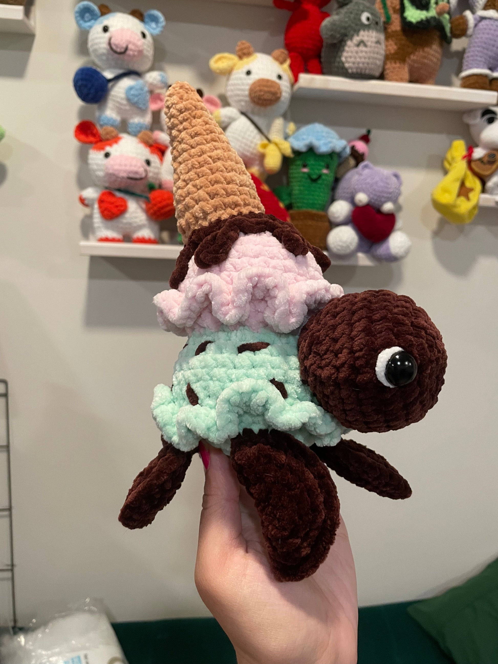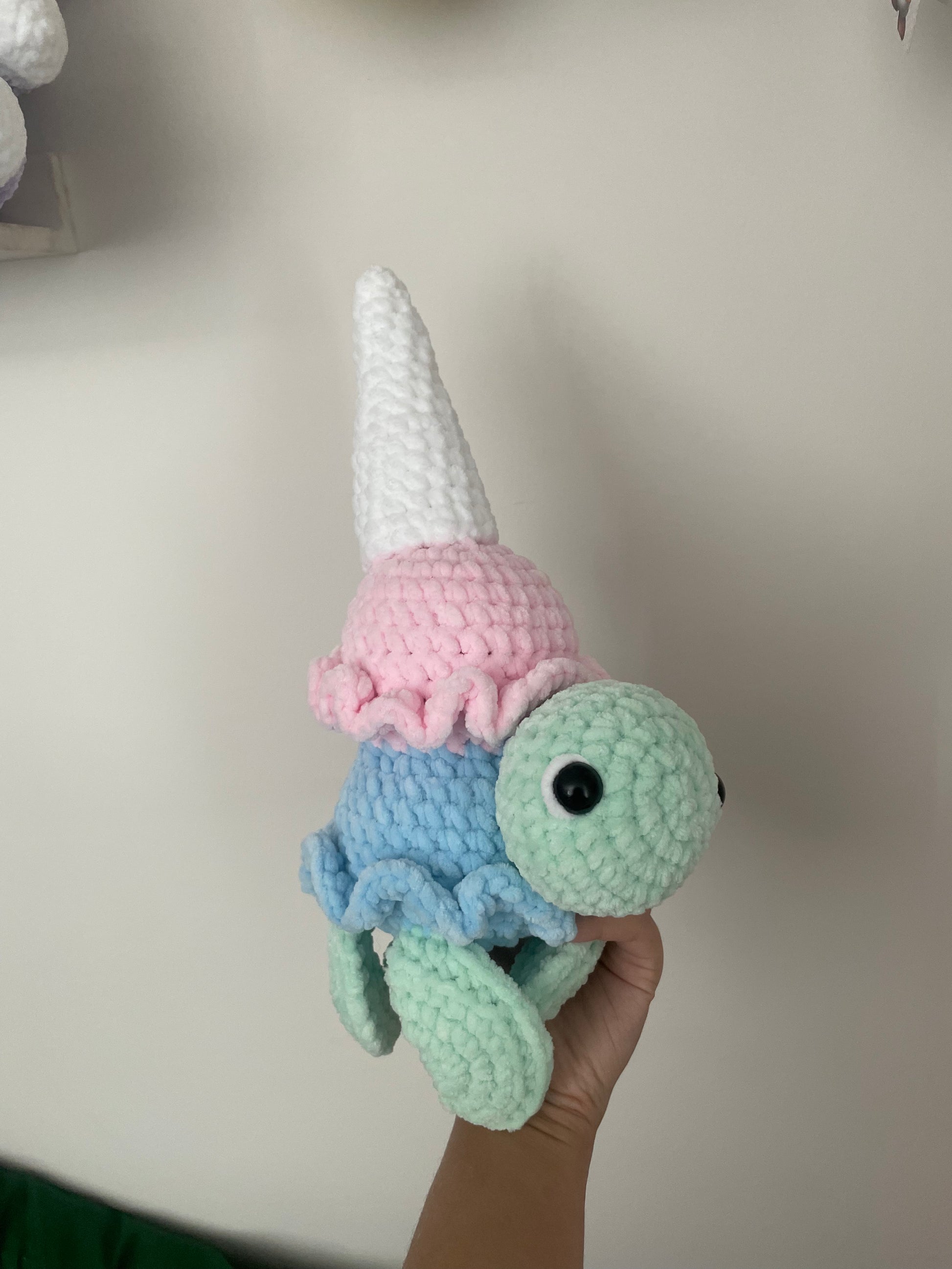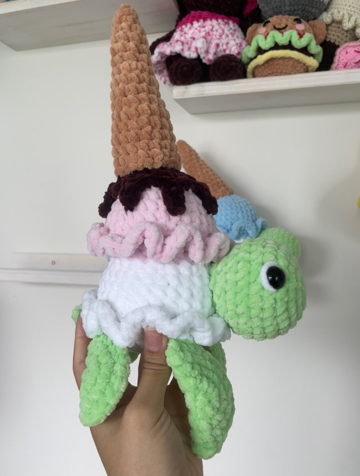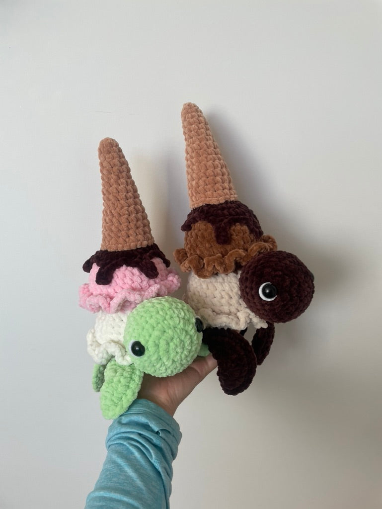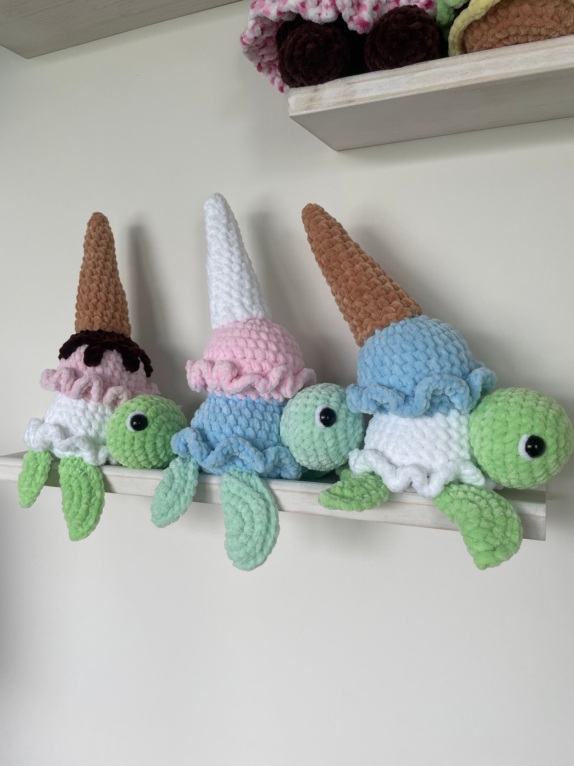 A double-scoop ice cream turtle handmade by @cocorocrochet. It features color customizable cone, scoops, head, and fins. Scoops may include sprinkles or sauce drizzled on top. To custom order a specific color/flavor combination or add special requests, head over to the custom order request form.