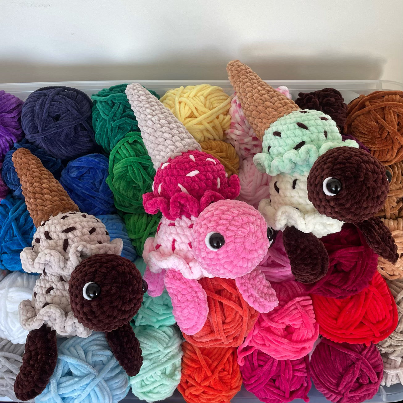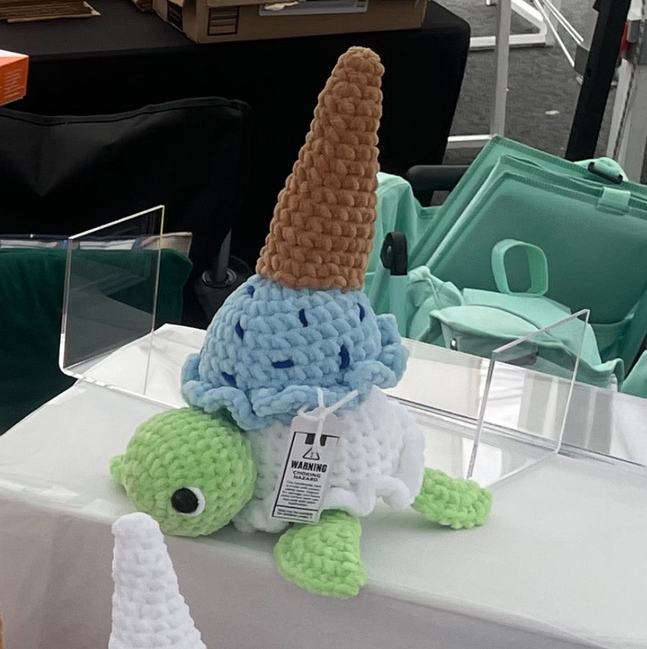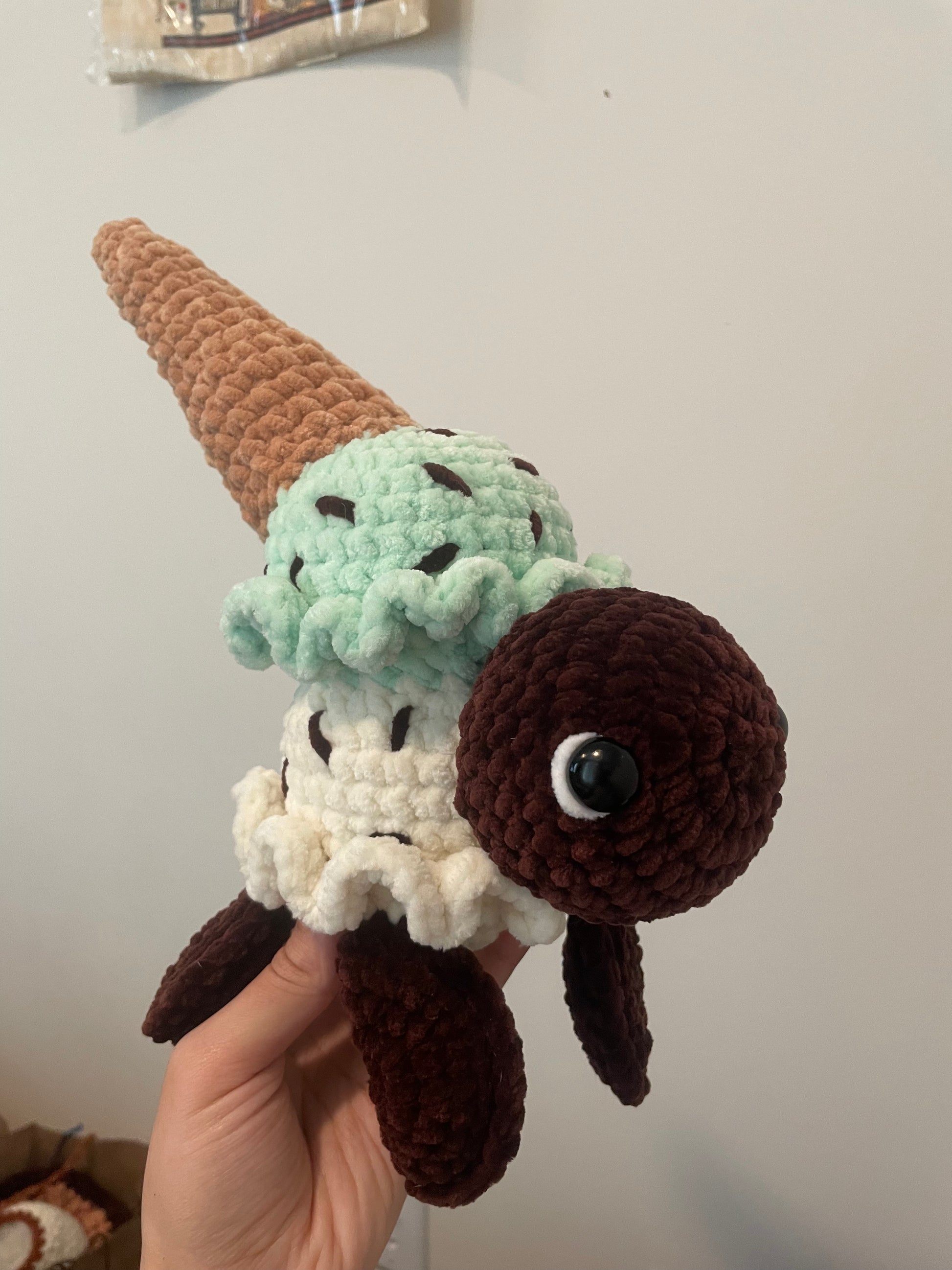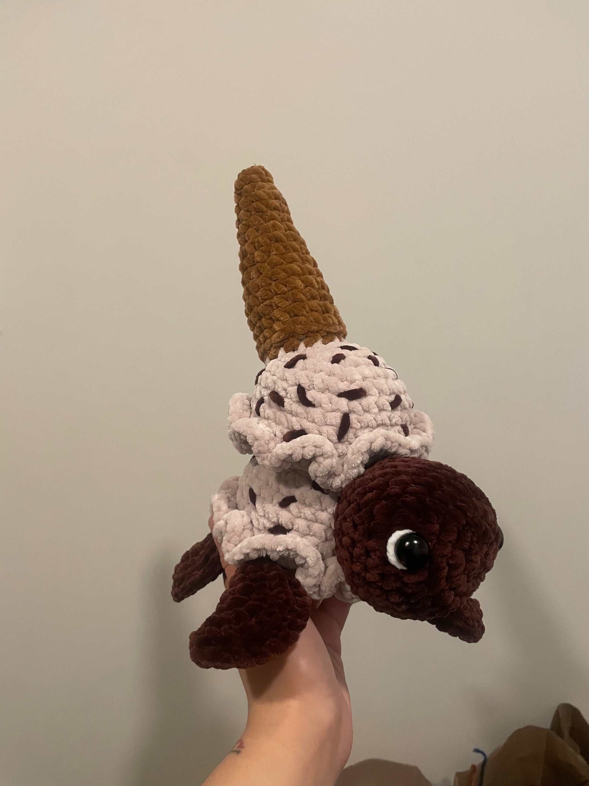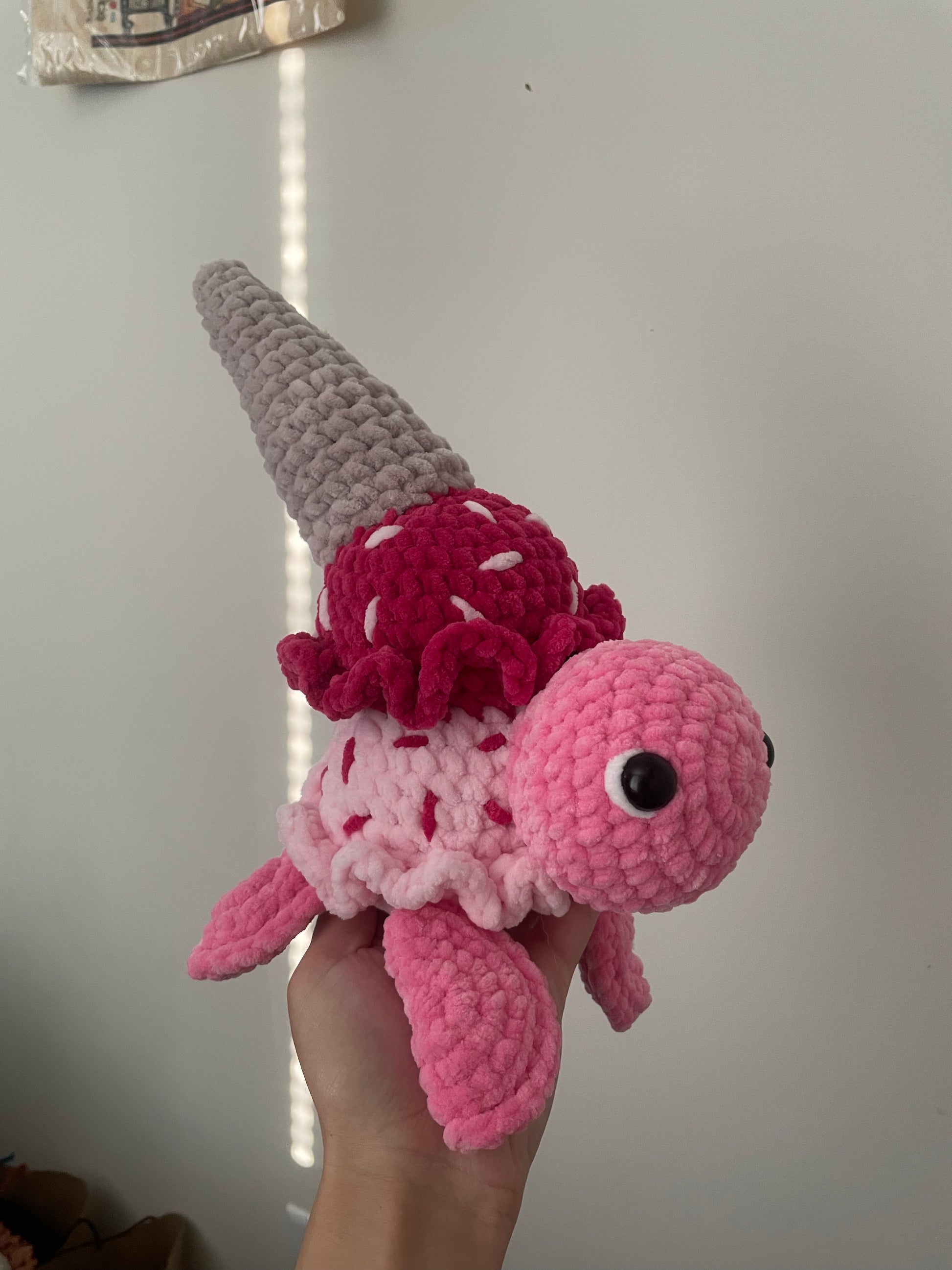 A double-scoop ice cream turtle handmade by @cocorocrochet. It features color customizable cone, scoops, head, and fins. Scoops may include sprinkles or sauce drizzled on top. To custom order a specific color/flavor combination or add special requests, head over to the custom order request form.