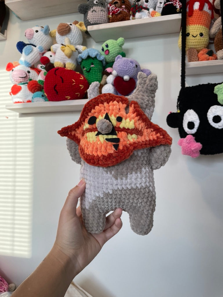 A Legend of Zelda inspired korok plushy handmade by @cocorocrochet. It features a korok holding branches with various mask options. To custom order a specific color combination, theme, or additional accessories, head over to the custom order request form.