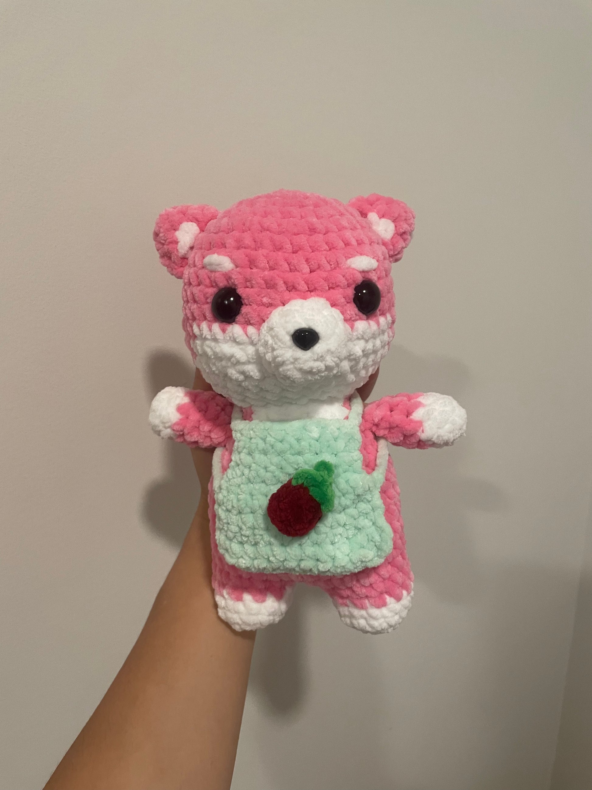 A sweet shiba puppy handmade by @cocorocrochet. It features a pup wearing an apron. To custom order a specific color combination, theme, or additional accessories, head over to the custom order request form.