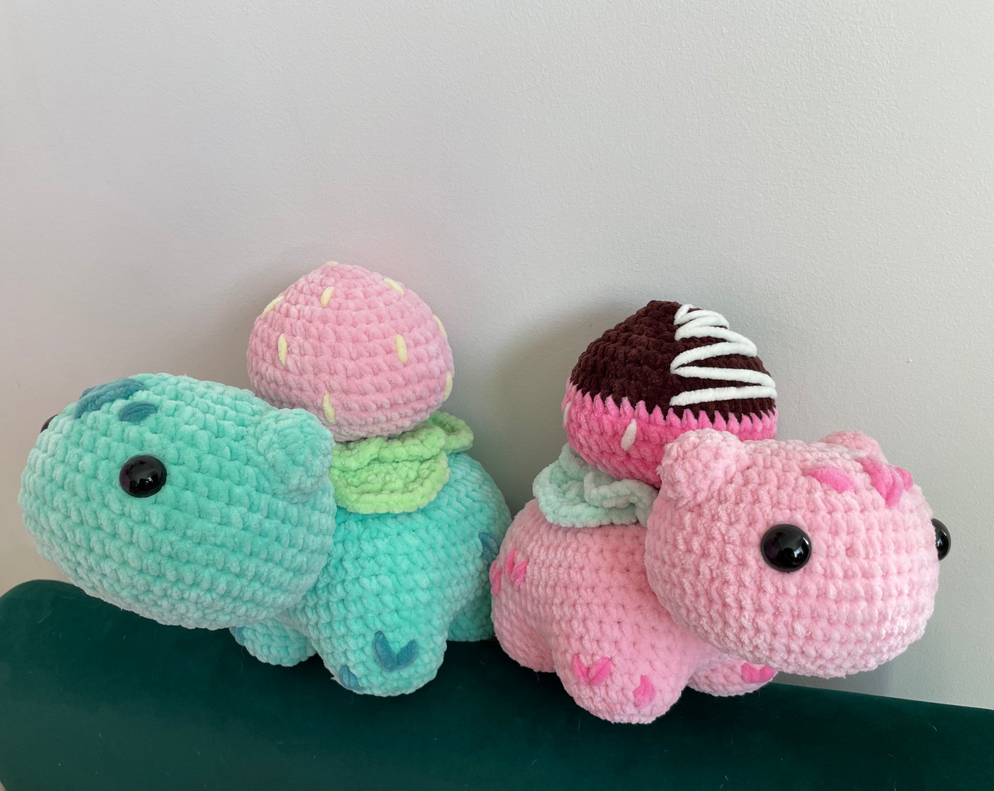 The cutest strawberry-themed bulbasaur handmade by @cocorocrochet. To custom order a specific color combination, theme, or additional accessories, head over to the custom order request form.